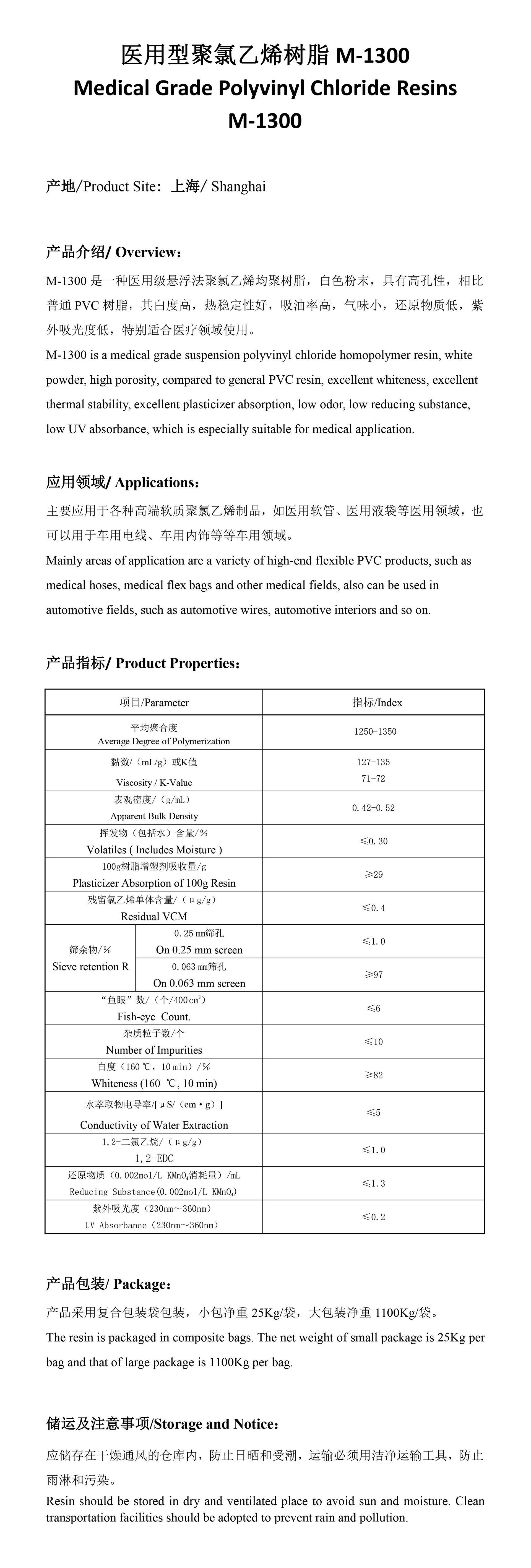 是一种医用高聚合度聚氯乙烯均聚树脂,白色粉末,具有高孔性,热稳定性好,吸油率高,制品物理性能优良。