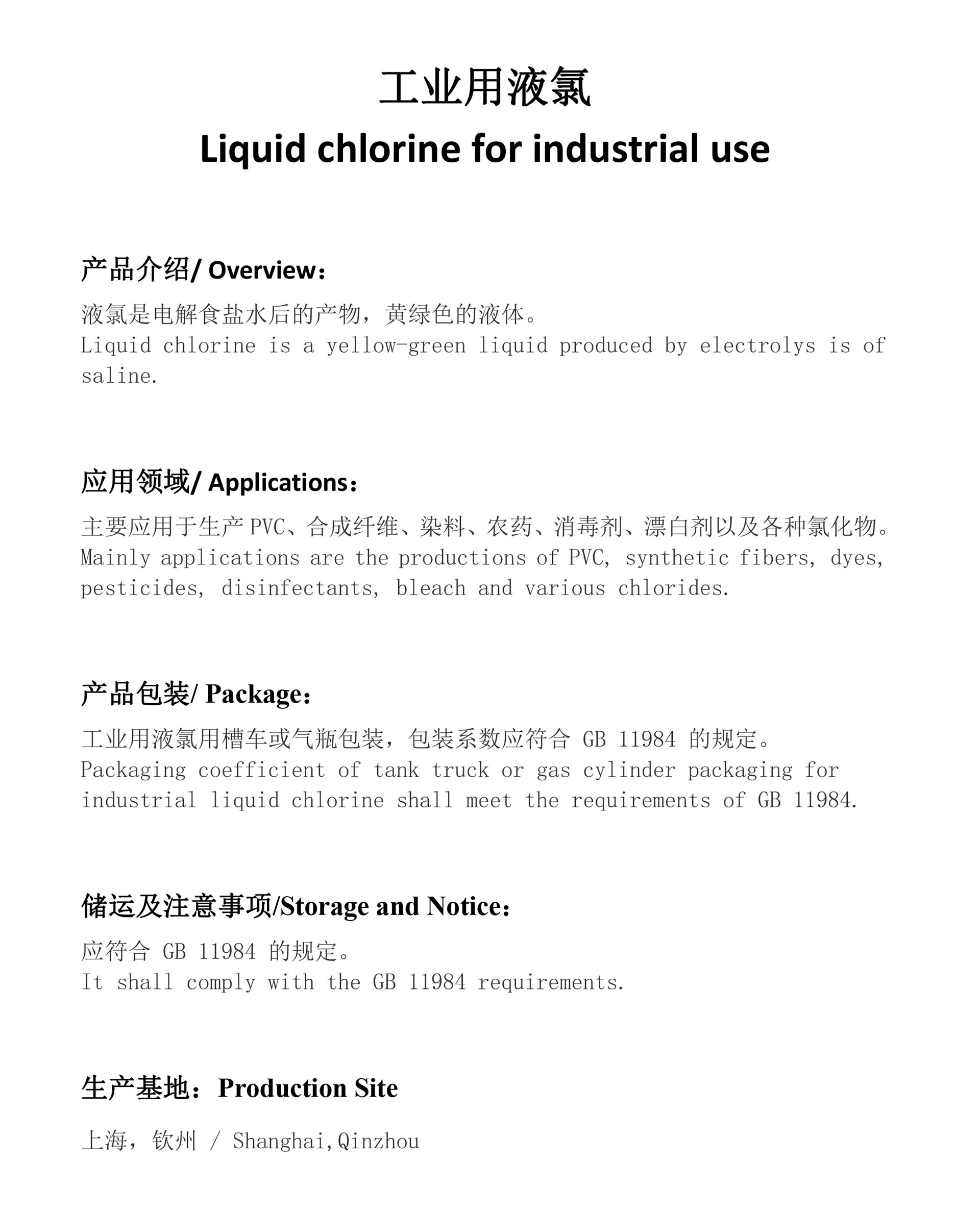 应用于生产PVC、合成纤维、染料、农药、消毒剂、漂白剂以及各种氯化物。
